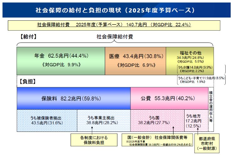高齢化の進展に伴い、年金・医療・福祉などの社会保障給付費は増加傾向にあります。2025年度は約140兆円に達し、そのうち事業主が負担した額は約38.8兆円です。