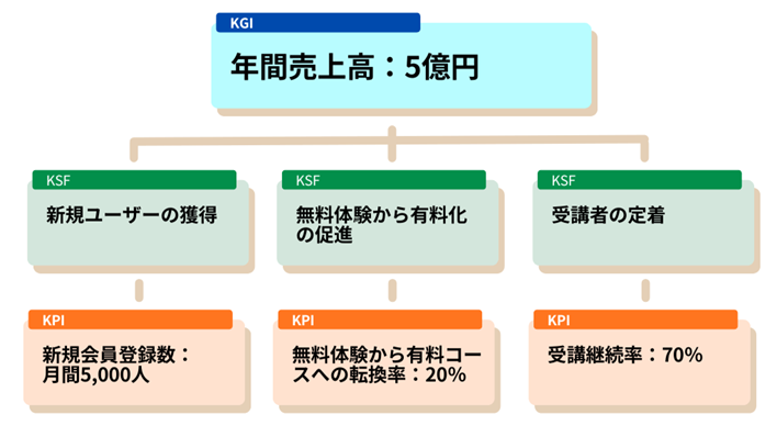 先ほどのオンライン学習サービスの例で考えると、KGI「年間売上高5億円」を達成するためのKSFは以下のとおりです。