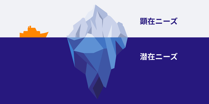 つまり、表面化していて把握しやすいのが顕在ニーズ、内面に隠れていて把握が難しいのが潜在ニーズです。
